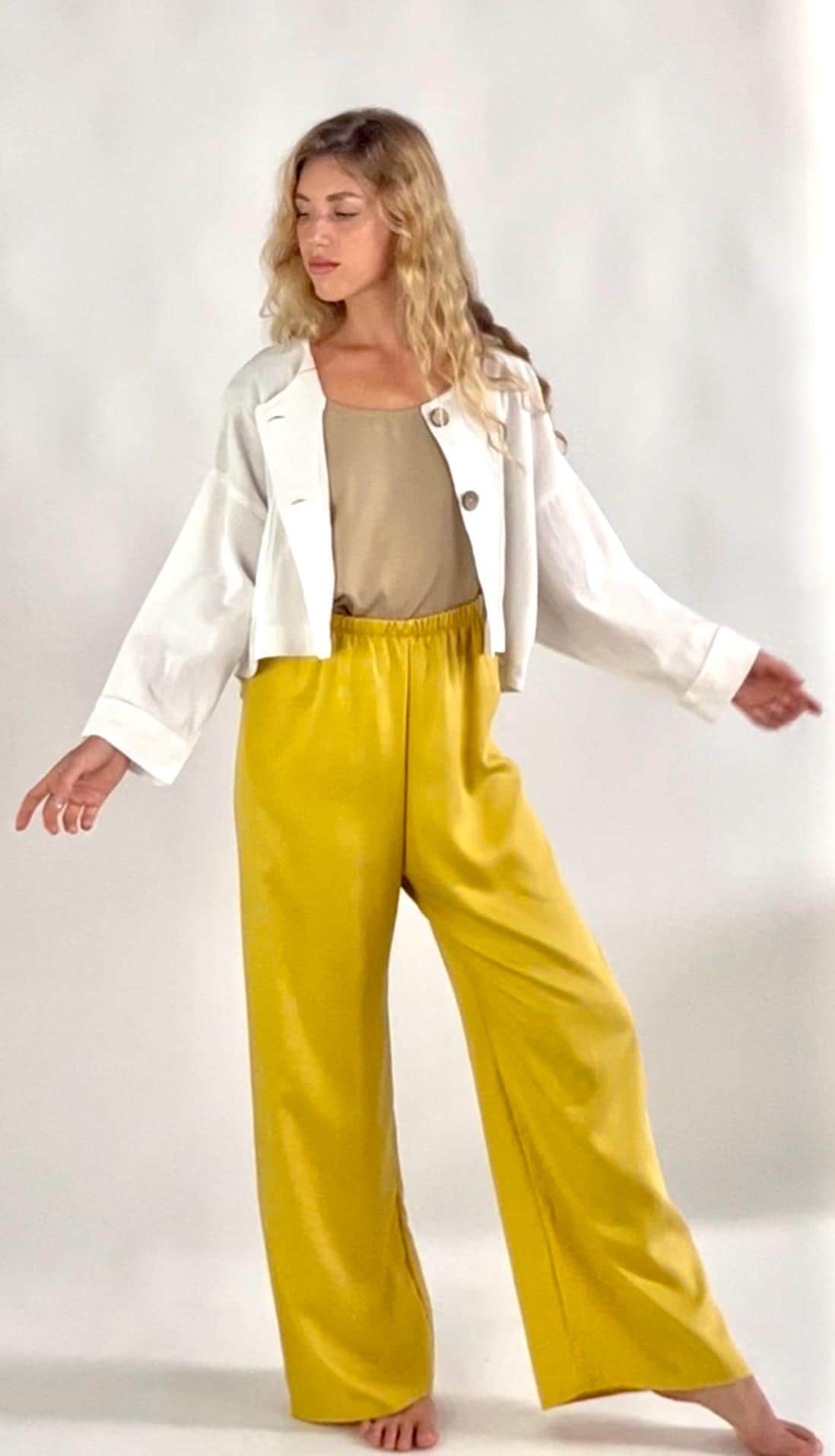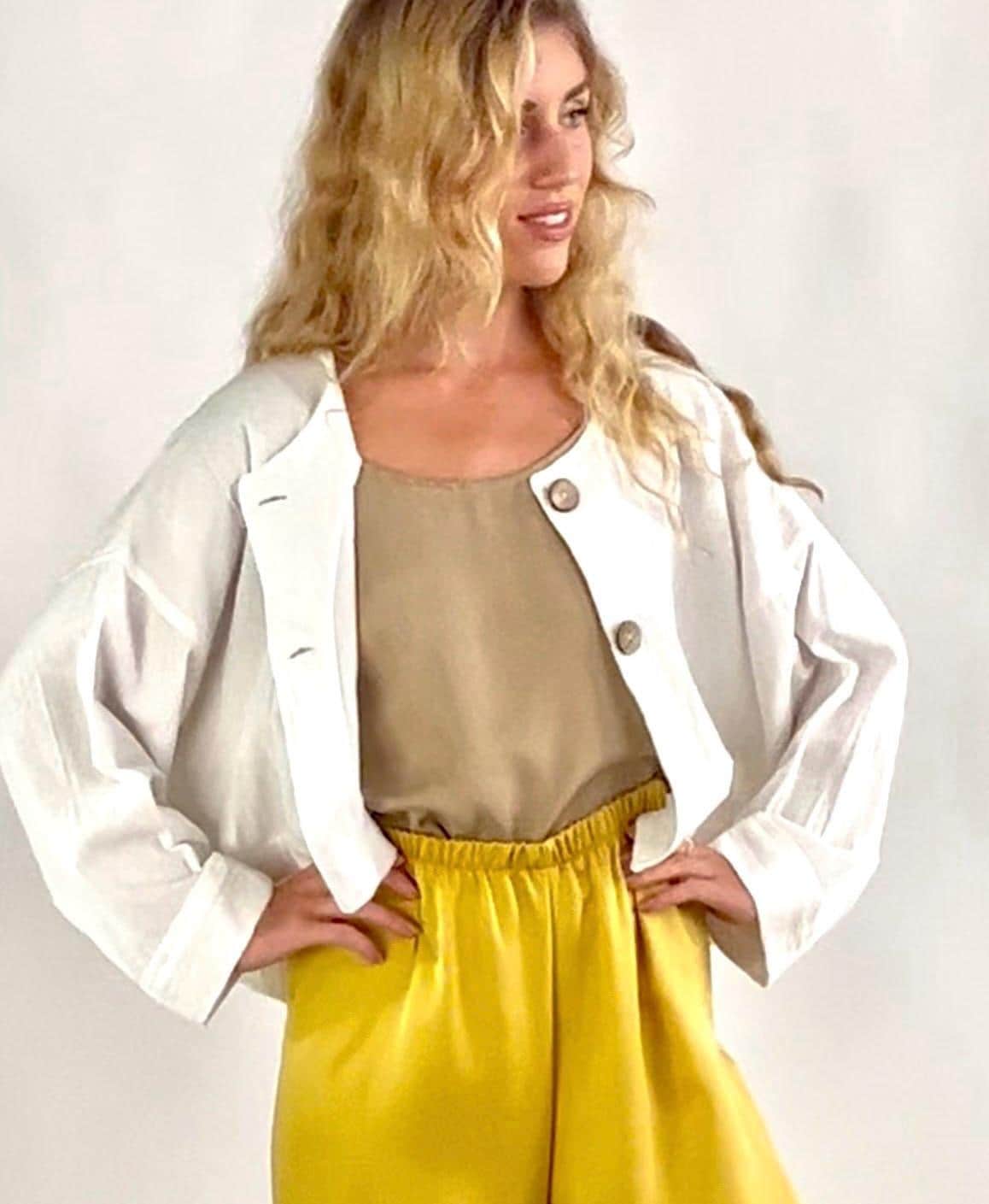 Linen Crop Jacket is beautifully handmade with a loose relaxed fit. Cuff Seams, Coconut shell buttons and pointed tail at back hem.