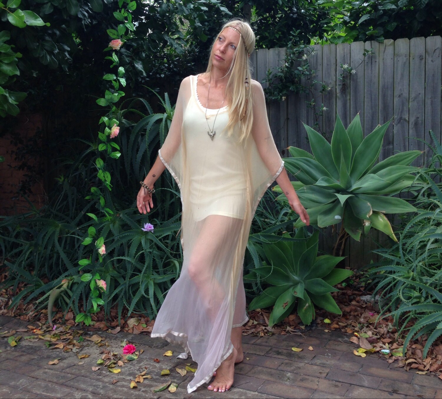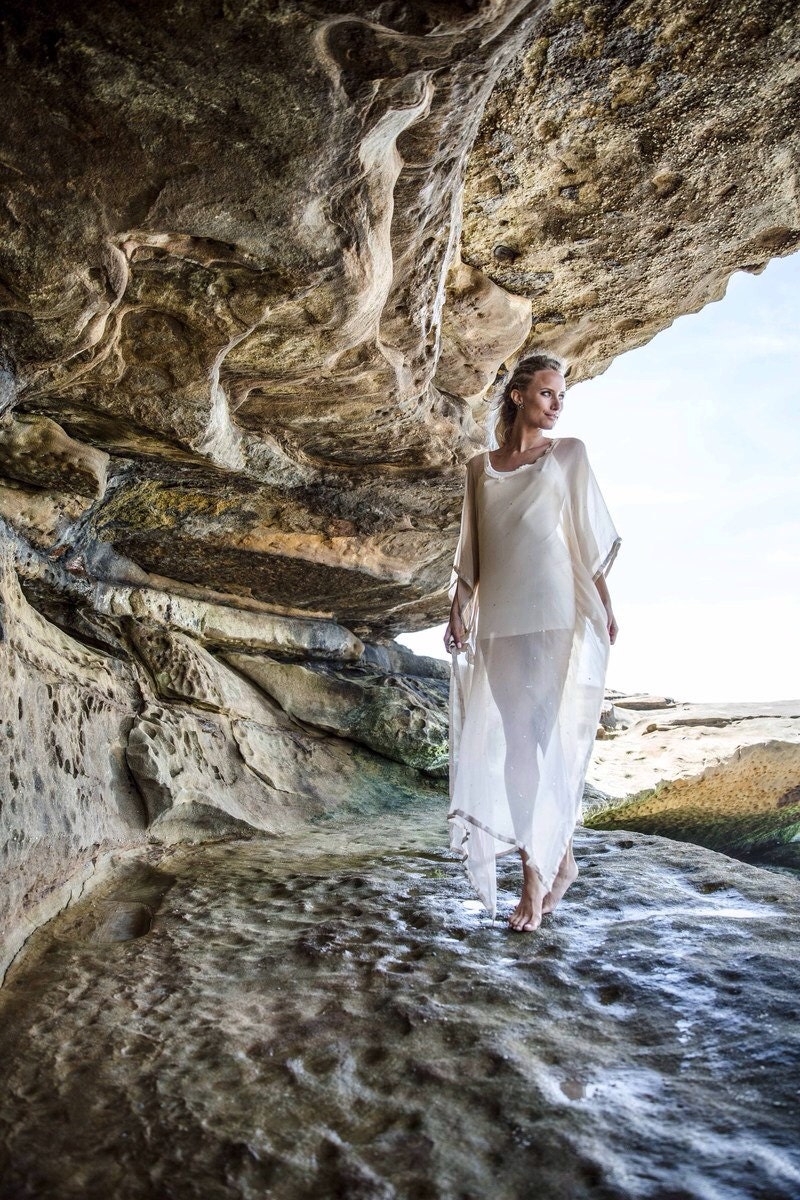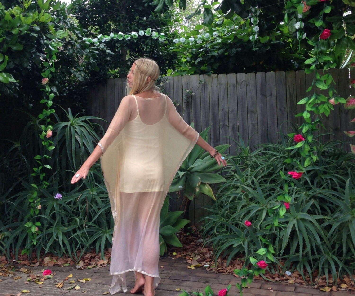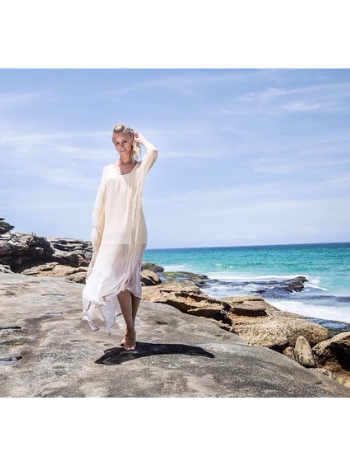 Stardust Silk Beaded Kaftan Dress, This is a one-off Fairtale garment. This design is unique handmade from Soft silk beaded chiffon, Vintage lace on the front neck trim, and beautifully Handmade for an evening/ day out.