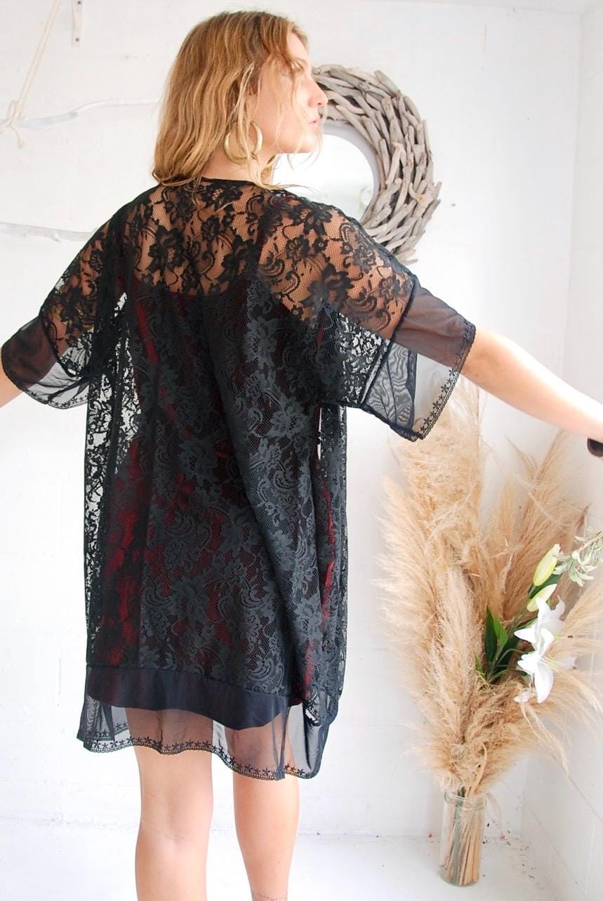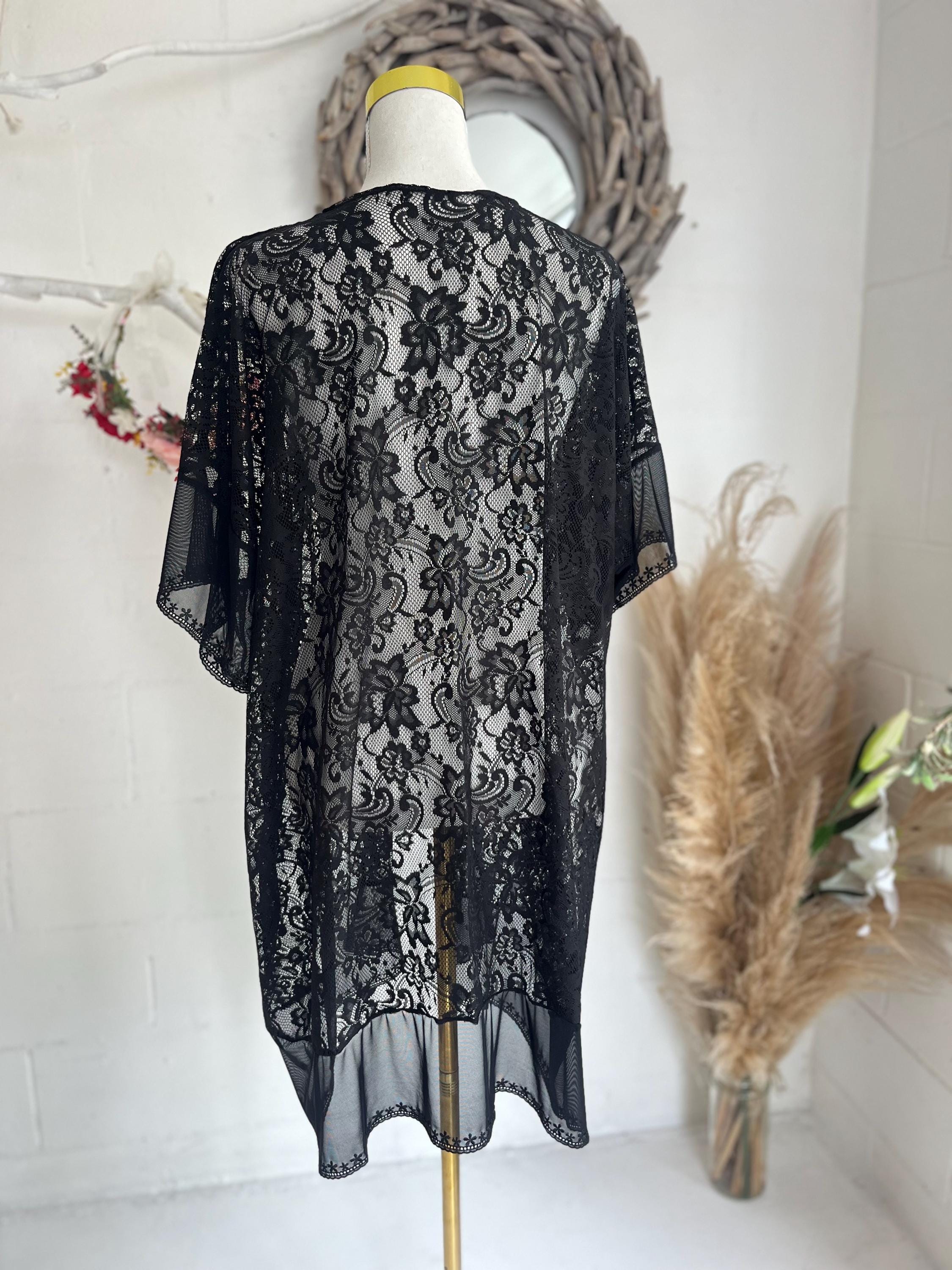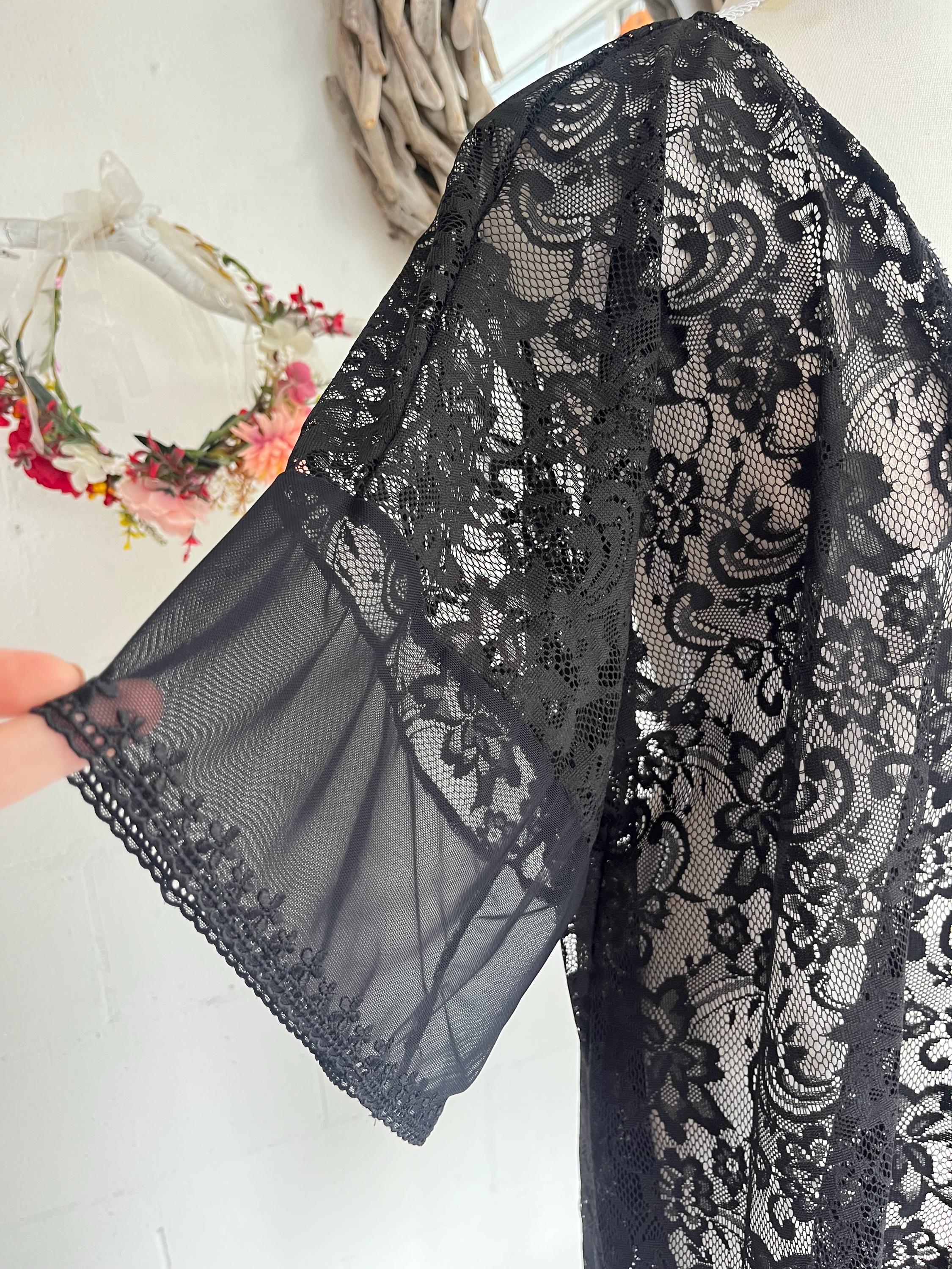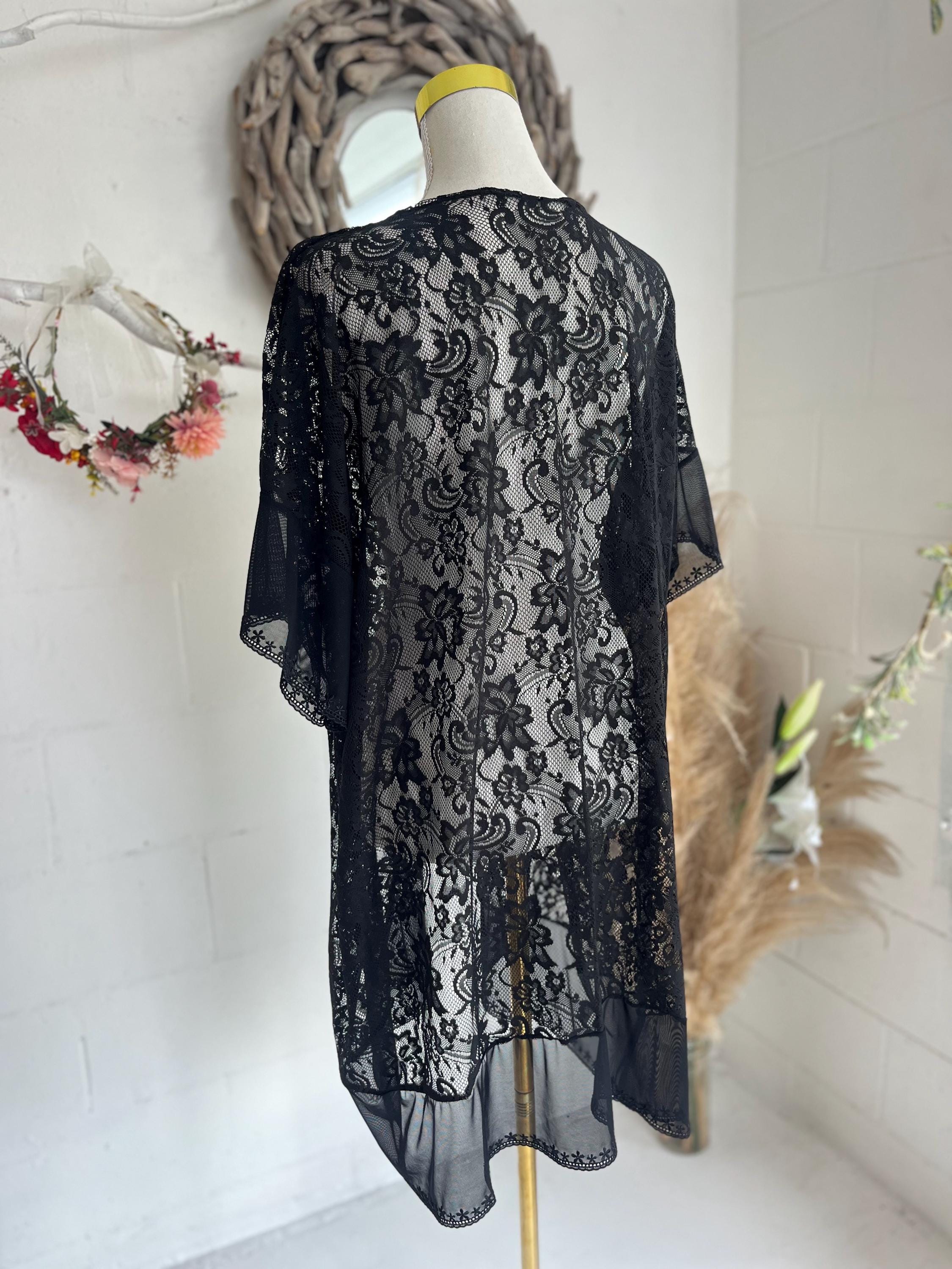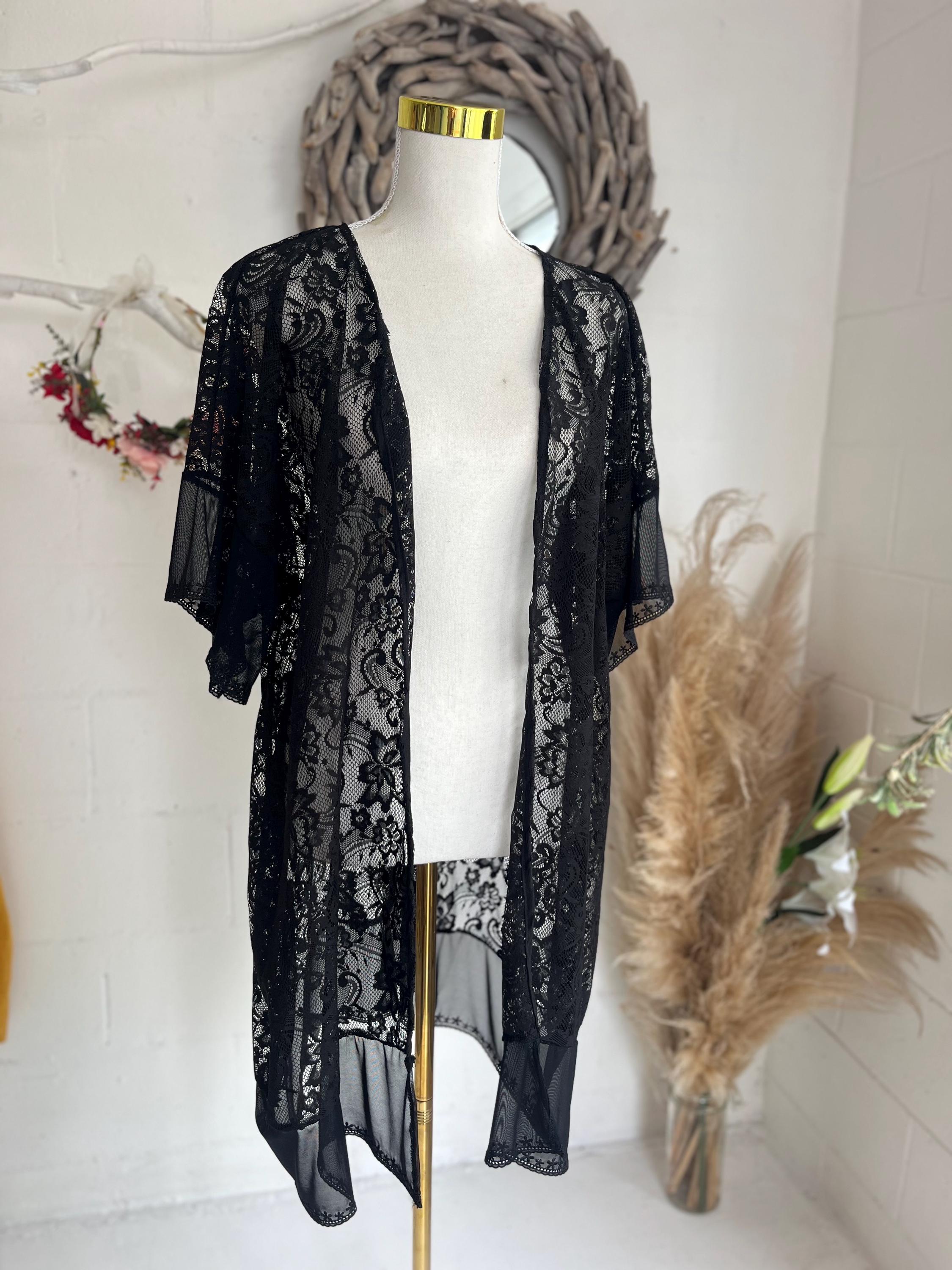 Black Moon Lace Fringe Kimono is a unique piece, Made from Eco lace fabric with sheer embroidery lace at hem.