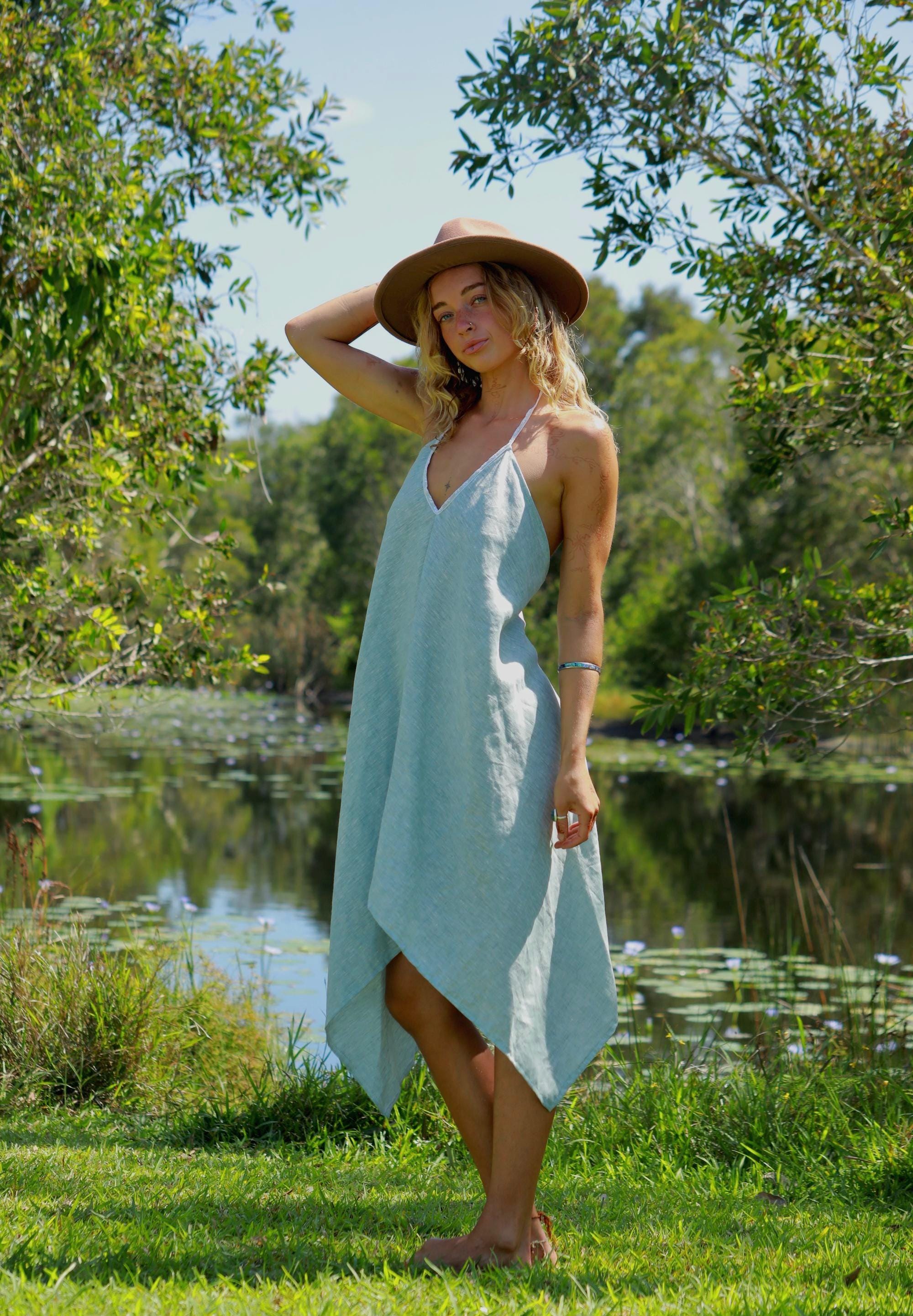 Linen Sundancer low back Dress, This is a limited edition Fairtale garment. This design is unique handmade from Eco 100% Linen. beautifully Handmade, low back east fit bias cut.